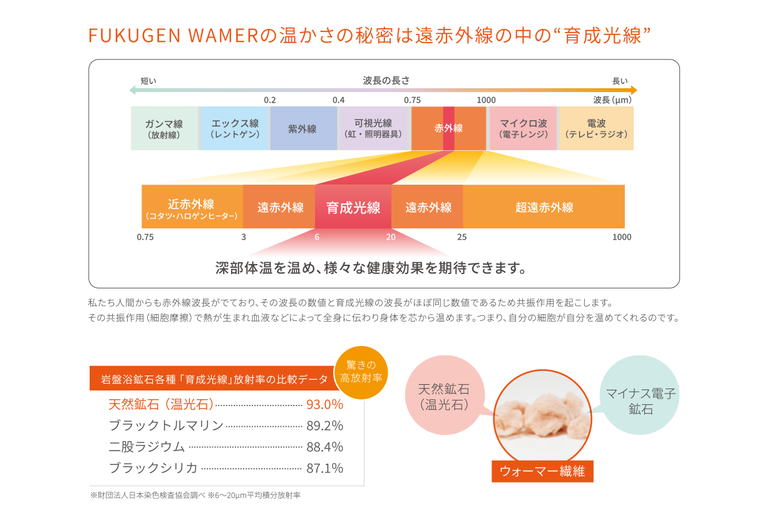 復元ウォーマーは、遠赤外線より、身体深部を温めてくれる温光石の天然鉱石を繊維にしているので、身体の熱を蓄熱しながら、深部からポカポカしてきます。温まってくると暑いほどです😊